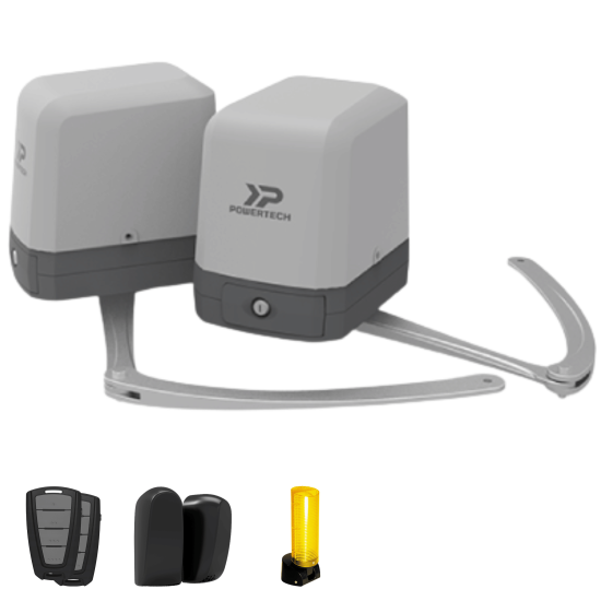 „Kitul automatizare poarta batanta Powertech PA250 oferă control inteligent prin smartphone, motoare puternice pentru porți de până la 2,5 m și 250 kg pe canat, plus telecomenzi, fotocelule și lampă de semnalizare — tot ce ai nevoie pentru acces automat, sigur și confortabil.”